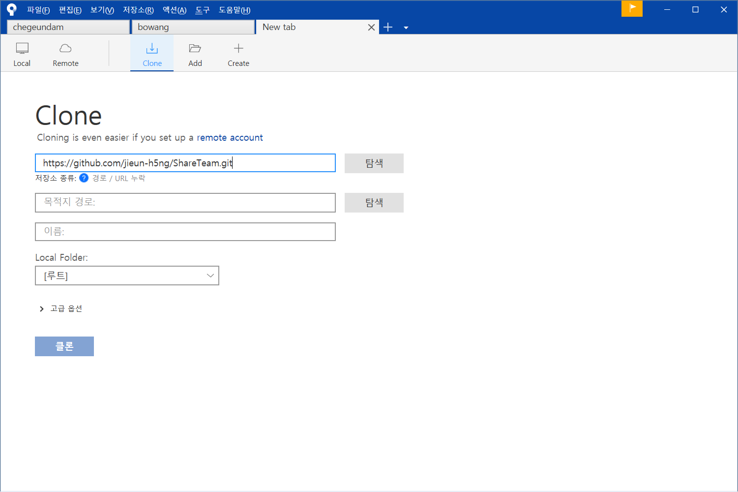 그리고 목적지 경로에는 로컬 저장소로 사용할 빈 폴더를 지정한다.