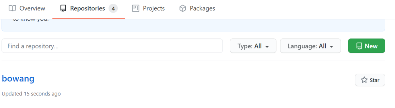 bowang 이라는 이름의 Repository가 생성된 것을 확인할 수 있다.