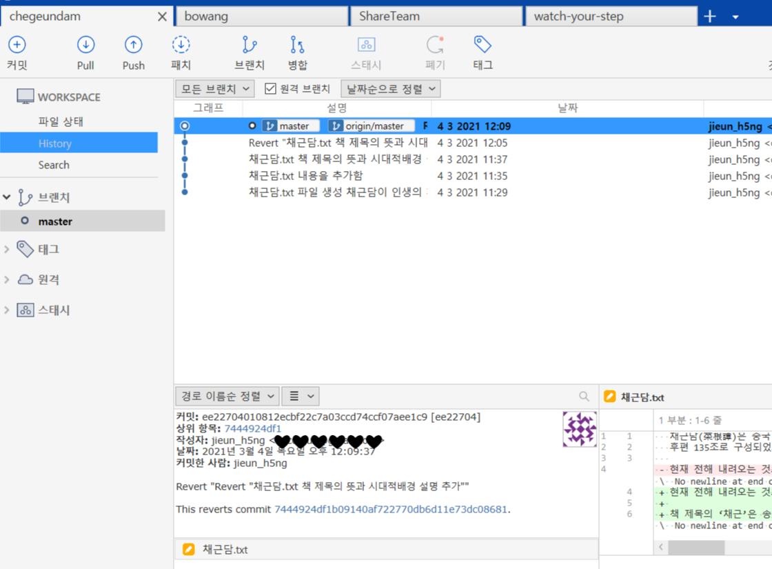 커밋 내용이 '책 제목의 뜻과 ~' 였던 상태로 되돌아갔음을 확인할 수 있다.