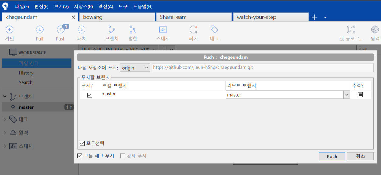 5. PUSH: 로컬저장소에 저장된 변경사항을 서버에 업로드