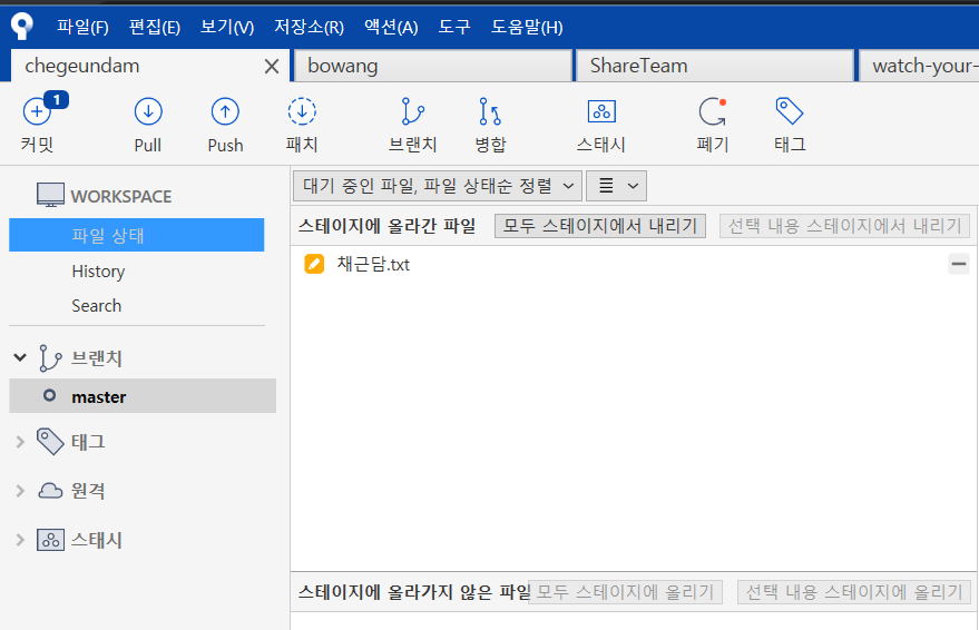 스테이지에 올린다는 것은 변경사항이 원격저장소에도 적용될 예정임을 뜻한다.