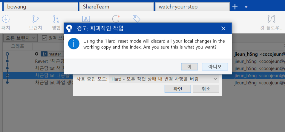hard 속성을 선택하면 해당 커밋 당시로 돌아간다. 파괴적인 작업이기에 경고 단계가 많다.