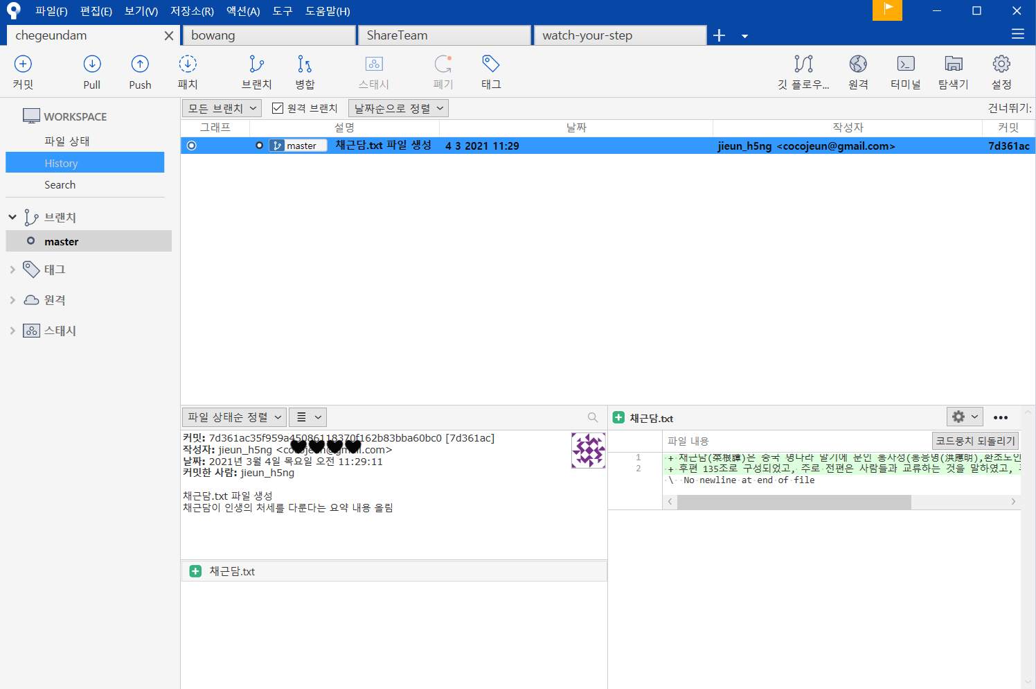 커밋한 내용은 master 브랜치에서 확인할 수 있다.