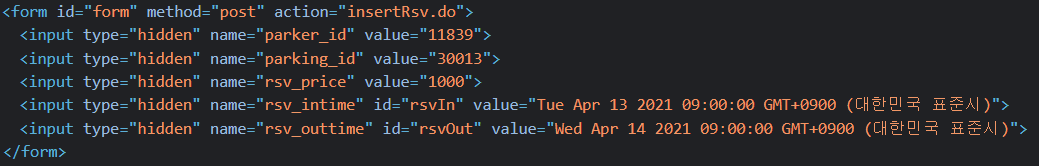 결제페이지를 지나 예약테이블에 insert 될값을 전달하도록, 결제페이지에 심어준 코드이다