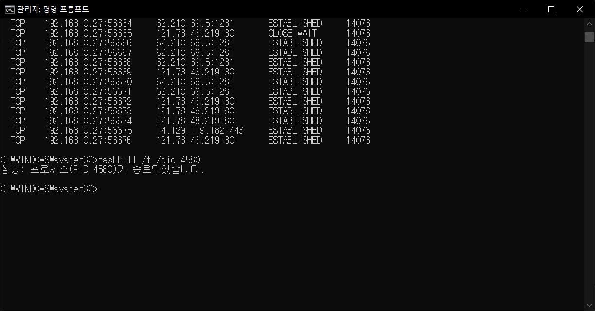 taskkill 단어에서도 보이듯이, 포트를 사용중인 태스크를 종료하라는 명령이다.